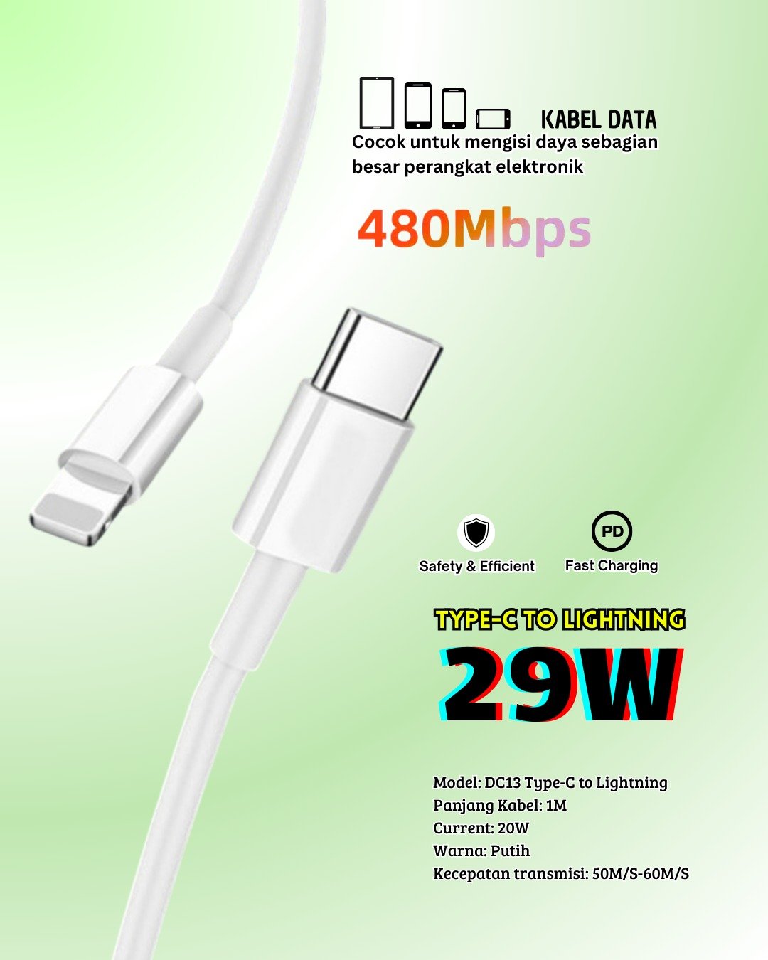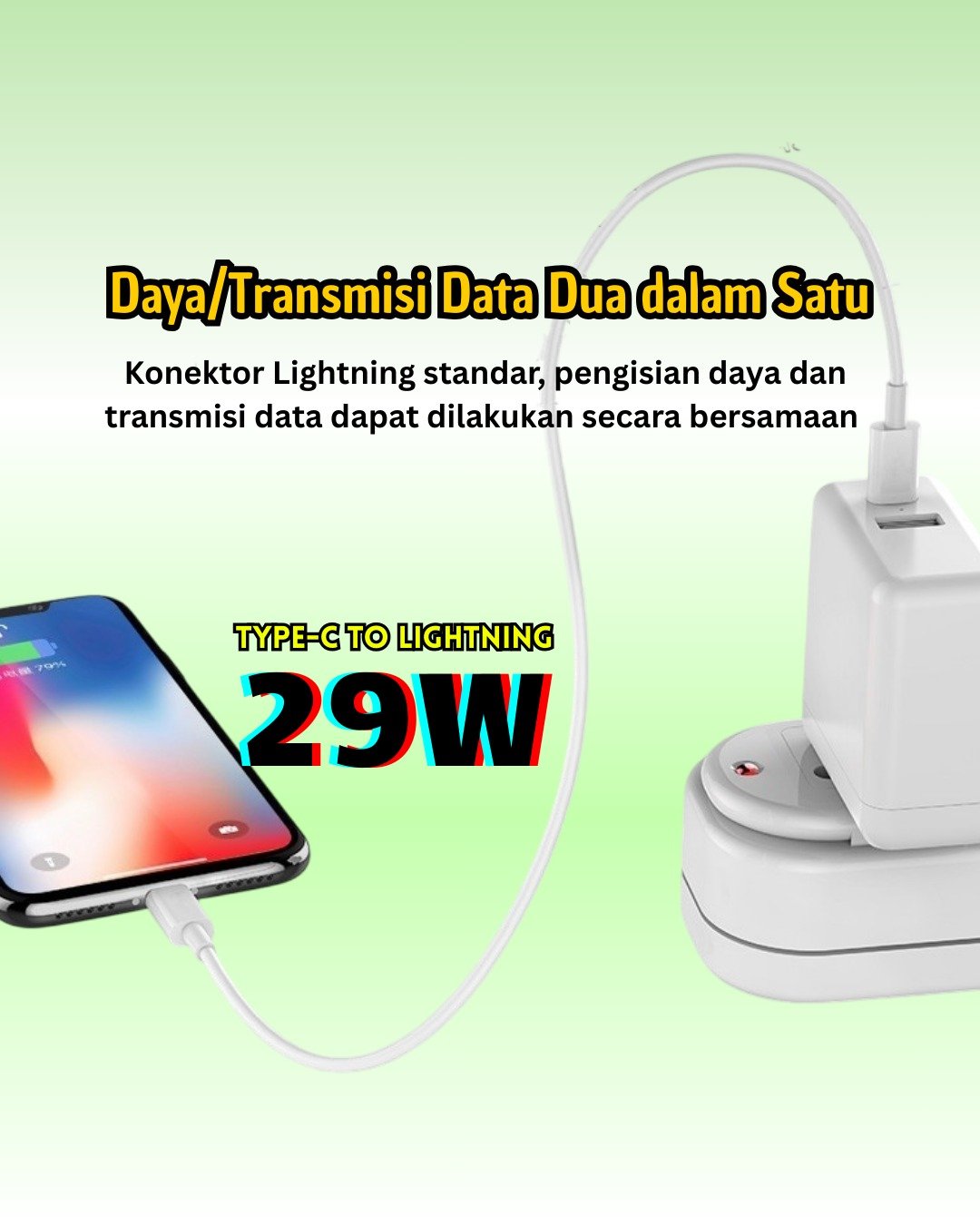 Mendukung teknologi PD Fast Charging hingga 29W untuk pengisian yang efisien dan cepat. Selain itu, kabel ini juga dapat digunakan untuk transfer data dengan kecepatan hingga 480 Mbps, sehingga proses sinkronisasi menjadi lebih lancar.