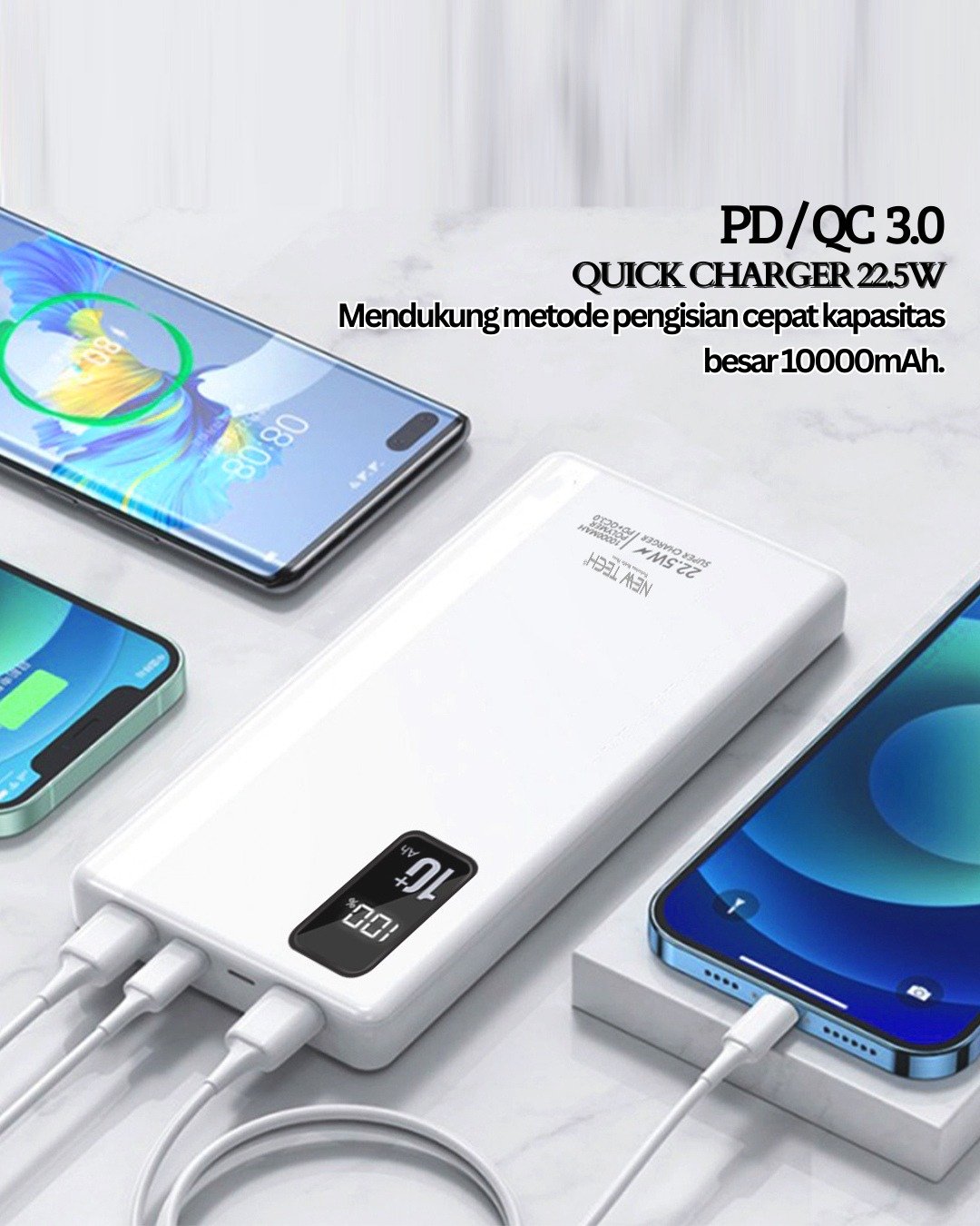 Mendukung teknologi Quick Charge 3.0 dan Power Delivery 3.0 hingga 22.5W. Memberikan pengisian super cepat untuk perangkat Anda, lebih efisien dibanding power bank biasa.