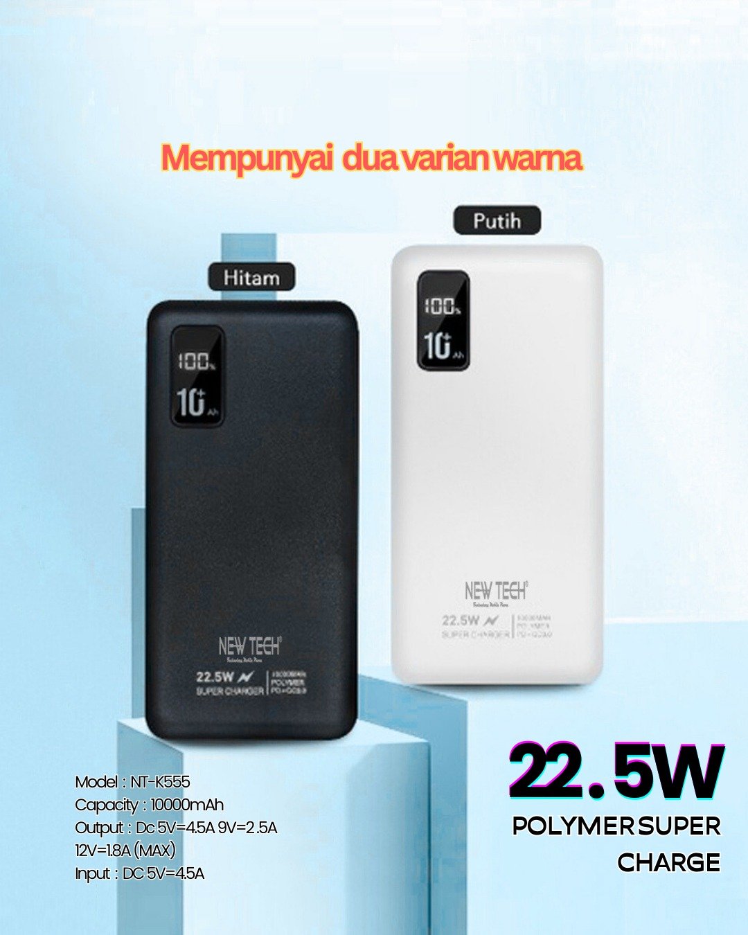 Dengan ukuran ramping (14 x 7 x 2 cm) dan bobot ringan, Power Bank NT-K555 mudah dibawa kemana saja. Hadir dalam dua pilihan warna elegan: Hitam & Putih.
