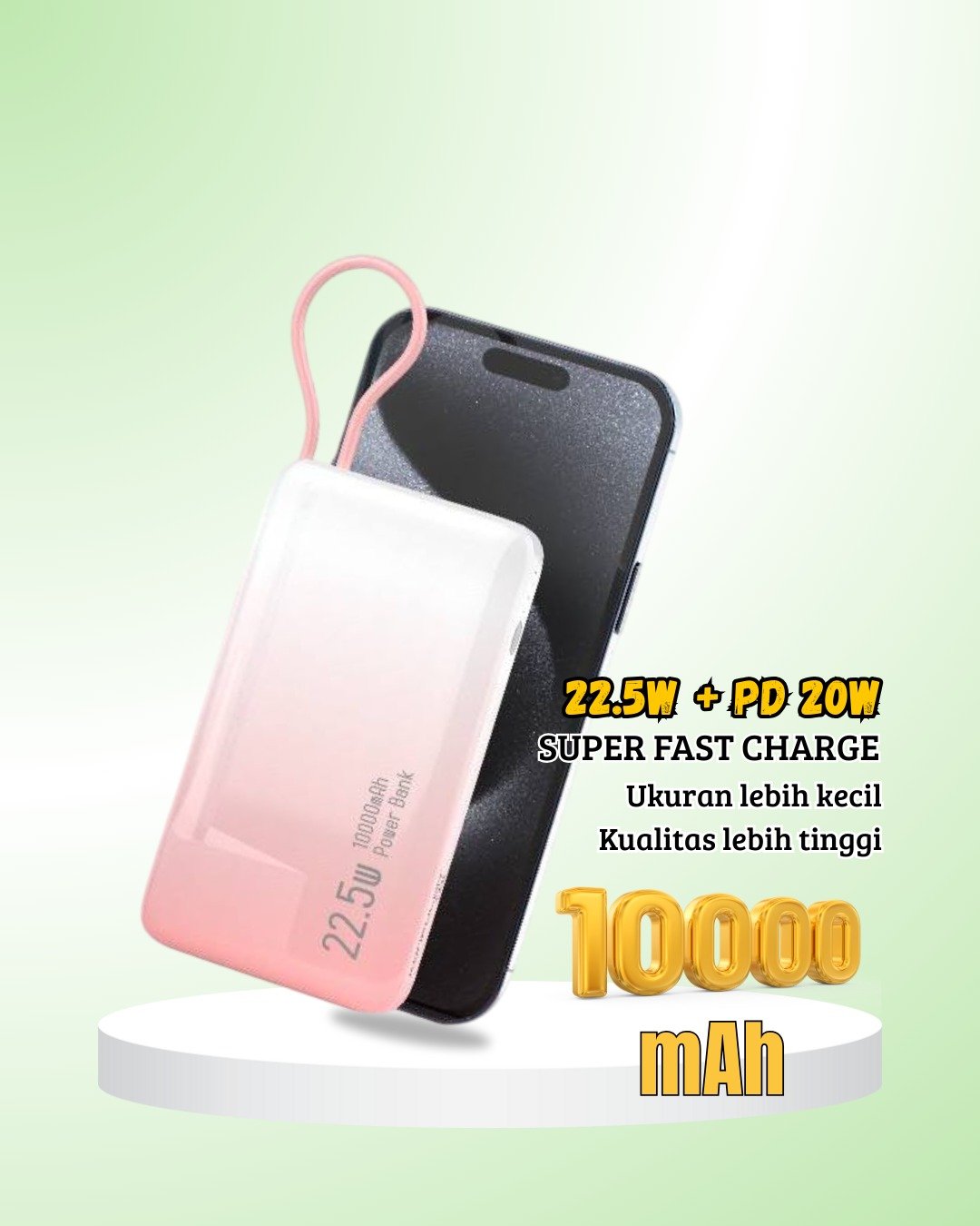 Power bank dengan desain ramping dan modern, dilengkapi kabel tipe-C bawaan untuk kemudahan pengisian kapan pun dan di mana pun. Hadir dalam warna elegan Blue dan Pink, cocok untuk melengkapi gaya aktif dan dinamis Anda.