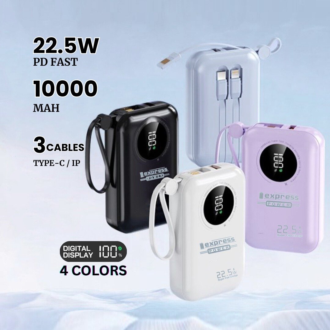 Dilengkapi 3 kabel bawaan (Type-C, iPhone, dan USB-A), sehingga kamu bisa langsung mengisi daya berbagai perangkat tanpa perlu membawa kabel tambahan.